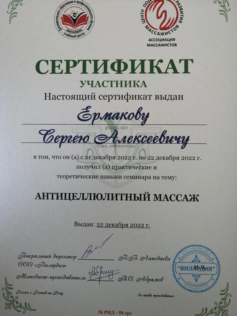- ООО «Вилардия», семинар «Антицеллюлитный массаж», 2022 г.