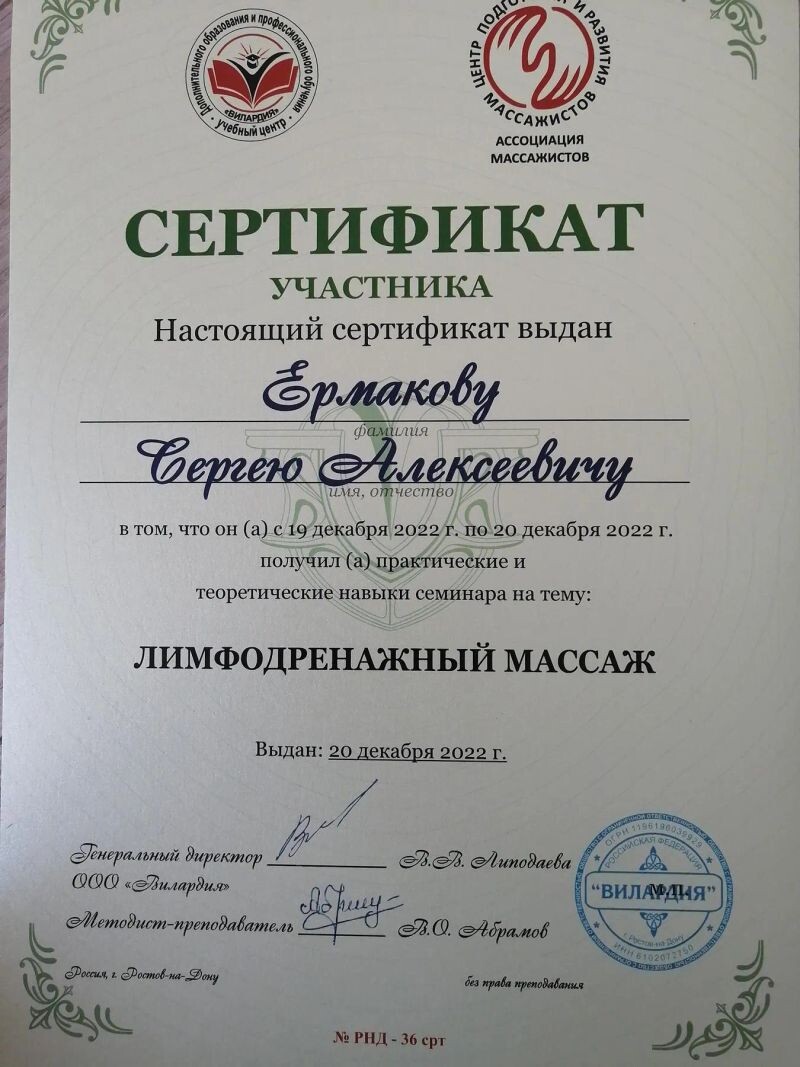 - ООО «Вилардия», семинар «Лимфодренажный массаж», 2022 г.