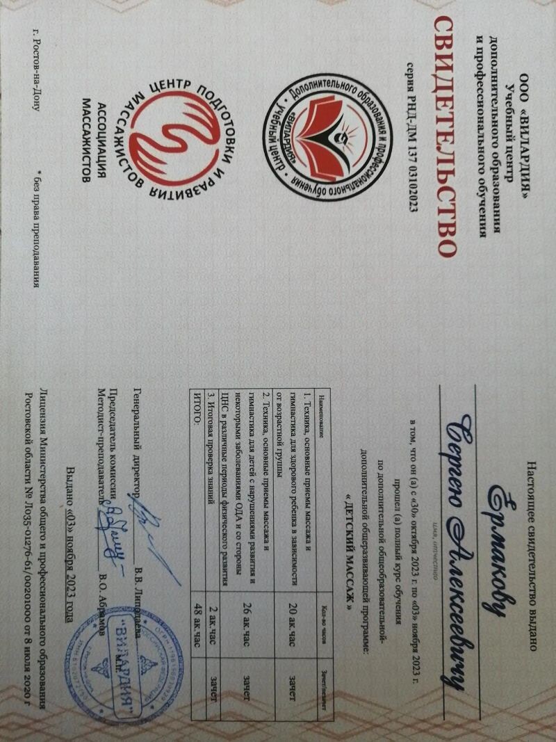 - ООО «Вилардия», детский массаж, 2023 г.
