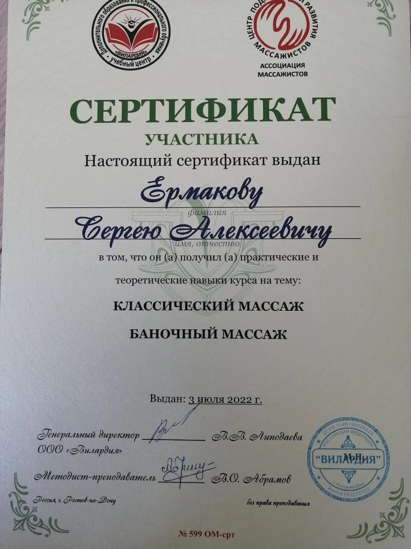 - ООО «Вилардия», курс «Классический массаж. Баночный массаж», 2022 г.