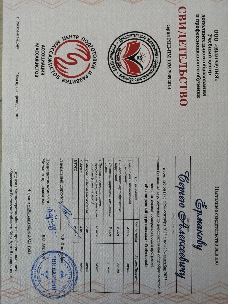 - ООО «Вилардия», расширенный курс массажа - Professional, 2023 г.
