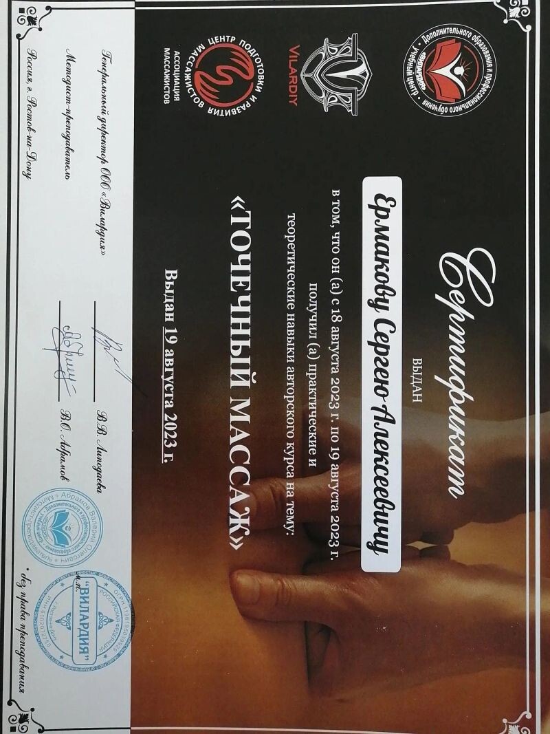 - ООО «Вилардия», курс «Точечный массаж», 2023 г.