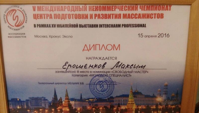 - V Международный некоммерческий чемпионат центра подготовки и развития массажистов, третье призовое место, 2016 г.