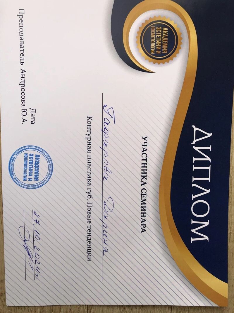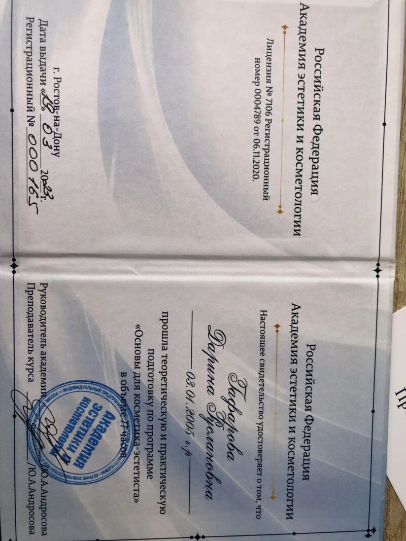 - Свидетельство о том, что являюсь косметологом-эстетистом (с 2023 г.).