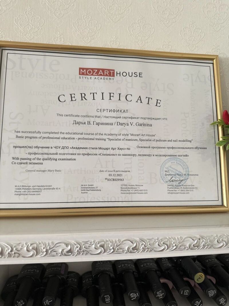 - Академия стиля Моцарт Арт Хаус, специалист по маникюру, педикюру и моделированию ногтей, 2021 г.