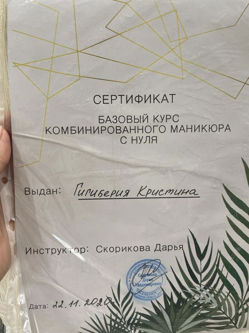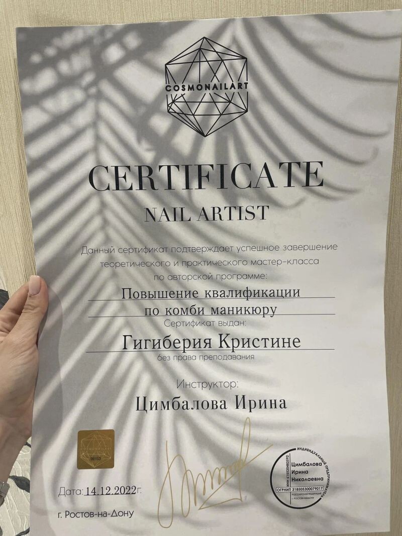 - Cosmonailart, повышение квалификации по комби-маникюру, 2022 г.