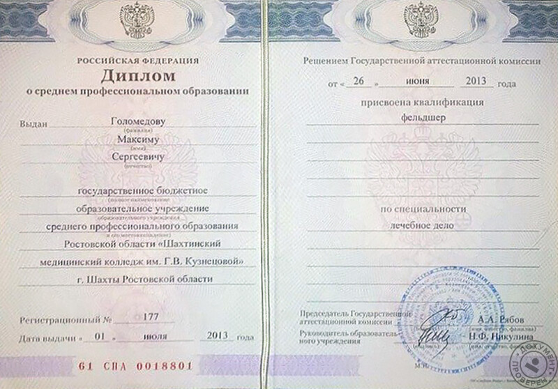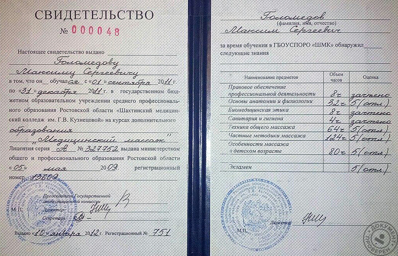 - ГБОУ СПО Ростовской области Шахтинский медицинский колледж им. Г.В. Кузнецовой, специальность – лечебное дело, квалификация: фельдшер (2013 г.), курсы дополнительного образования «Медицинский массаж» (2012 г.).