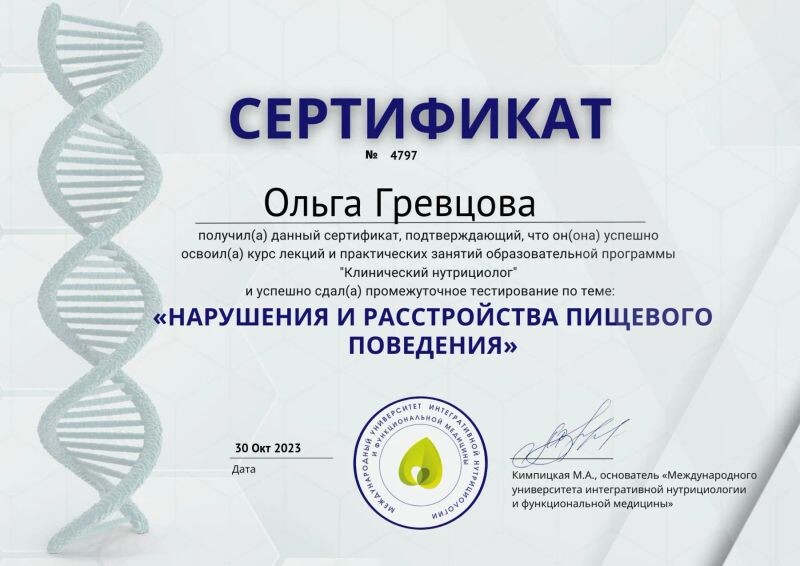 - Международный университет интегративной нутрициологии и функциональной медицины, нарушения и расстройства пищевого поведения, 2023 г.