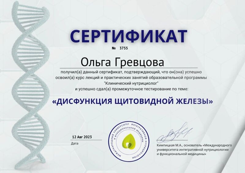 - Международный университет интегративной нутрициологии и функциональной медицины, дисфункция щитовидной железы, 2023 г.