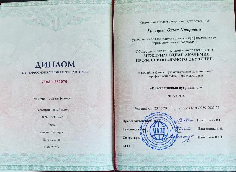 - «Международная академия профессионального обучения», интегративный нутрициолог, 2023 г.