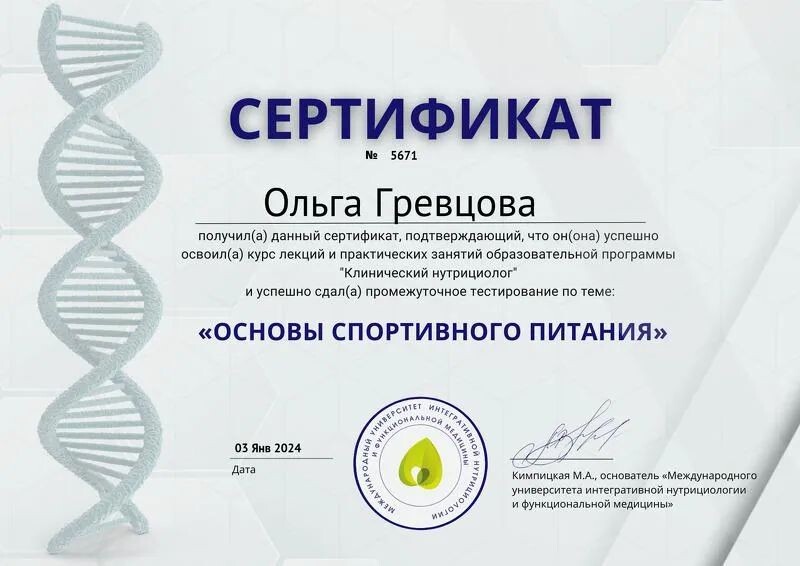 - Международный университет интегративной нутрициологии и функциональной медицины, основы спортивного питания, 2024 г.