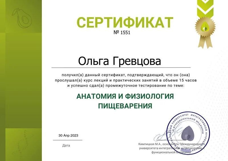 - Международный университет интегративной нутрициологии и функциональной медицины, анатомия и физиология пищеварения, 2023 г.
