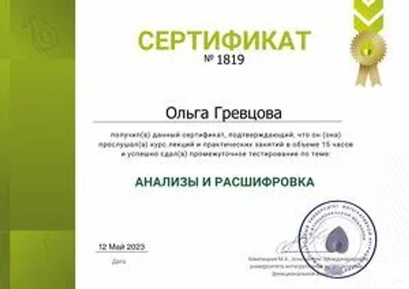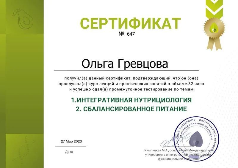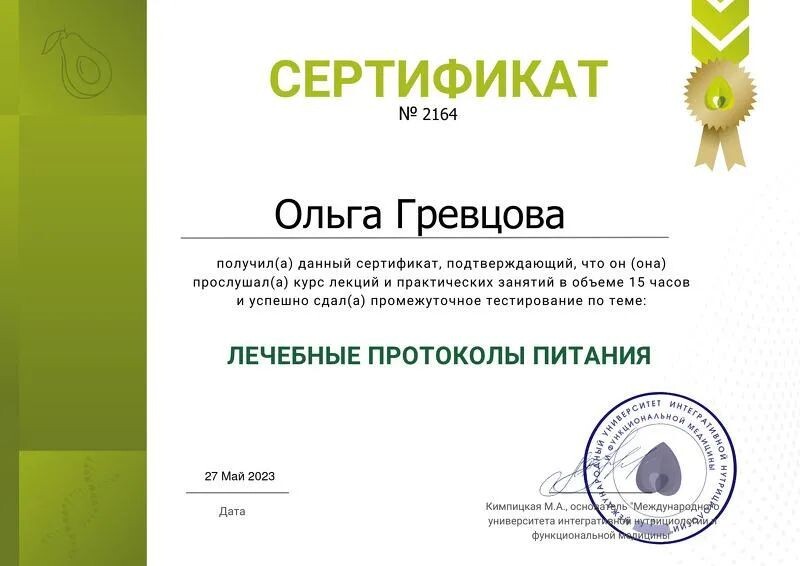 - Международный университет интегративной нутрициологии и функциональной медицины, лечебные протоколы питания, 15 ч, 2023 г.