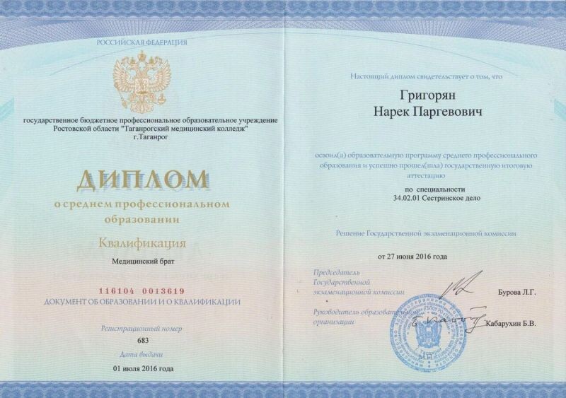 - Таганрогский медицинский колледж, медицинский брат, 2012–2016 гг.