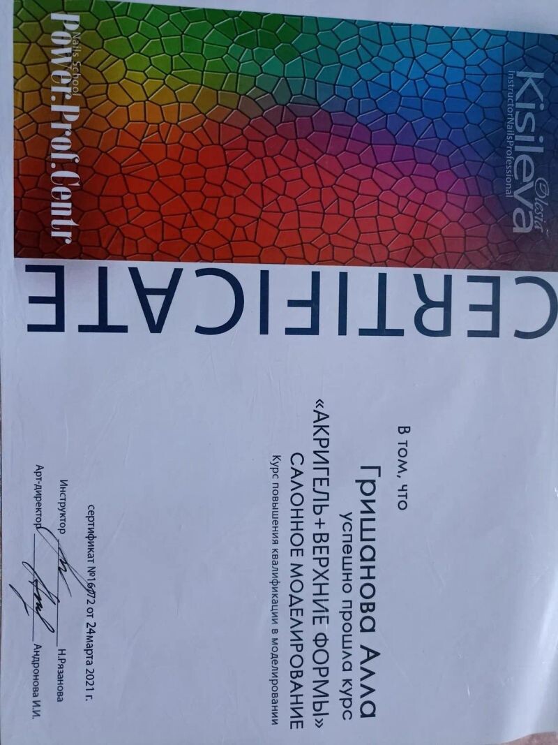 - Olesia Kisileva instructor nails professional, курс «акригель, верхние формы» салонное моделирование, 2021 г.