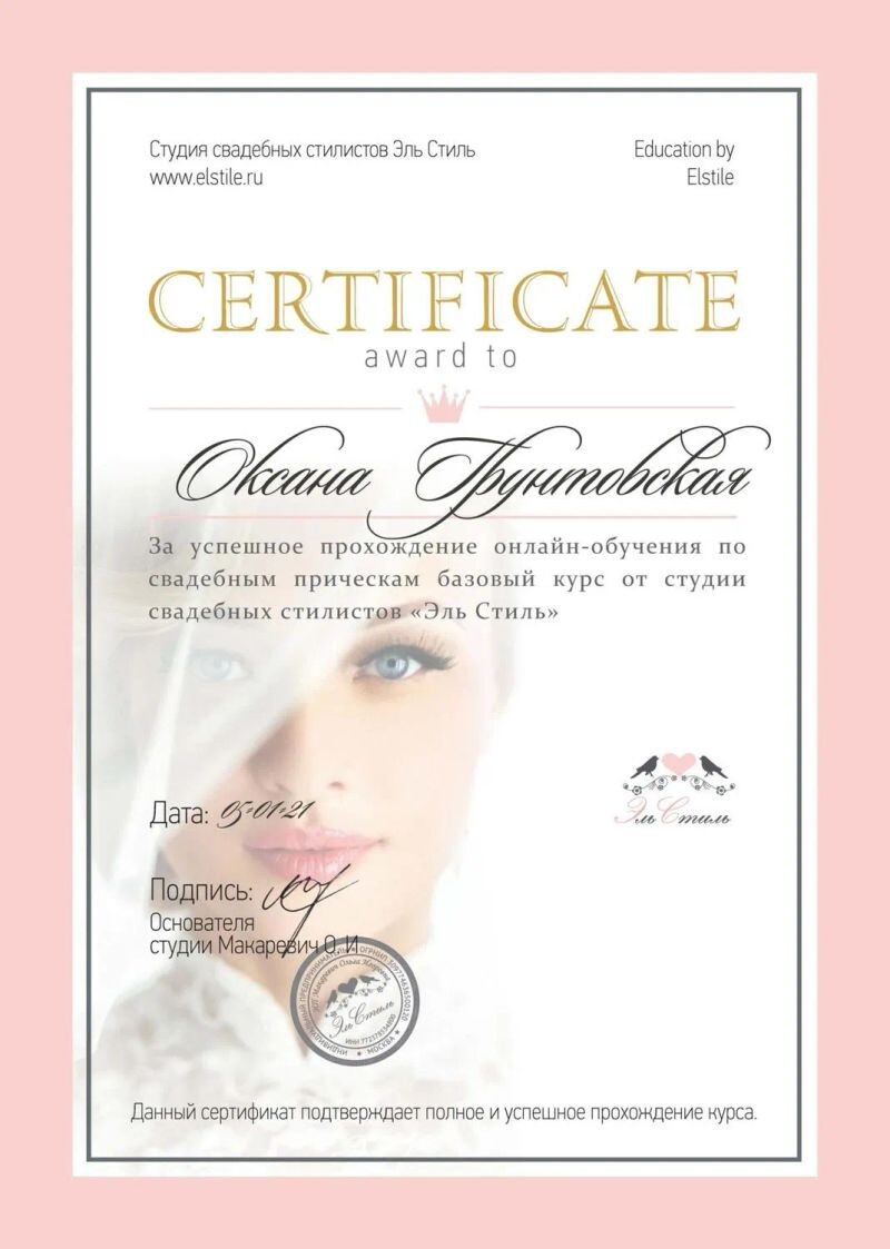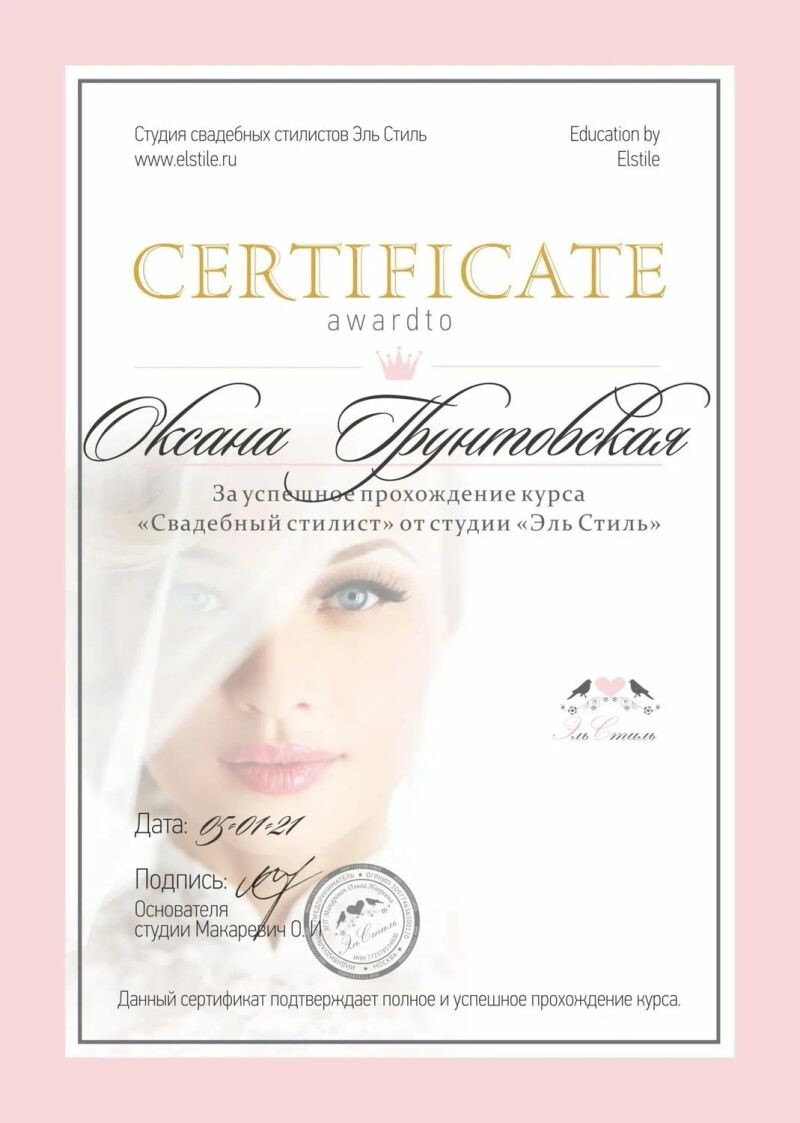 - Студия свадебных стилистов «Эль Стиль», курс «Свадебный стилист», 2021 г.
