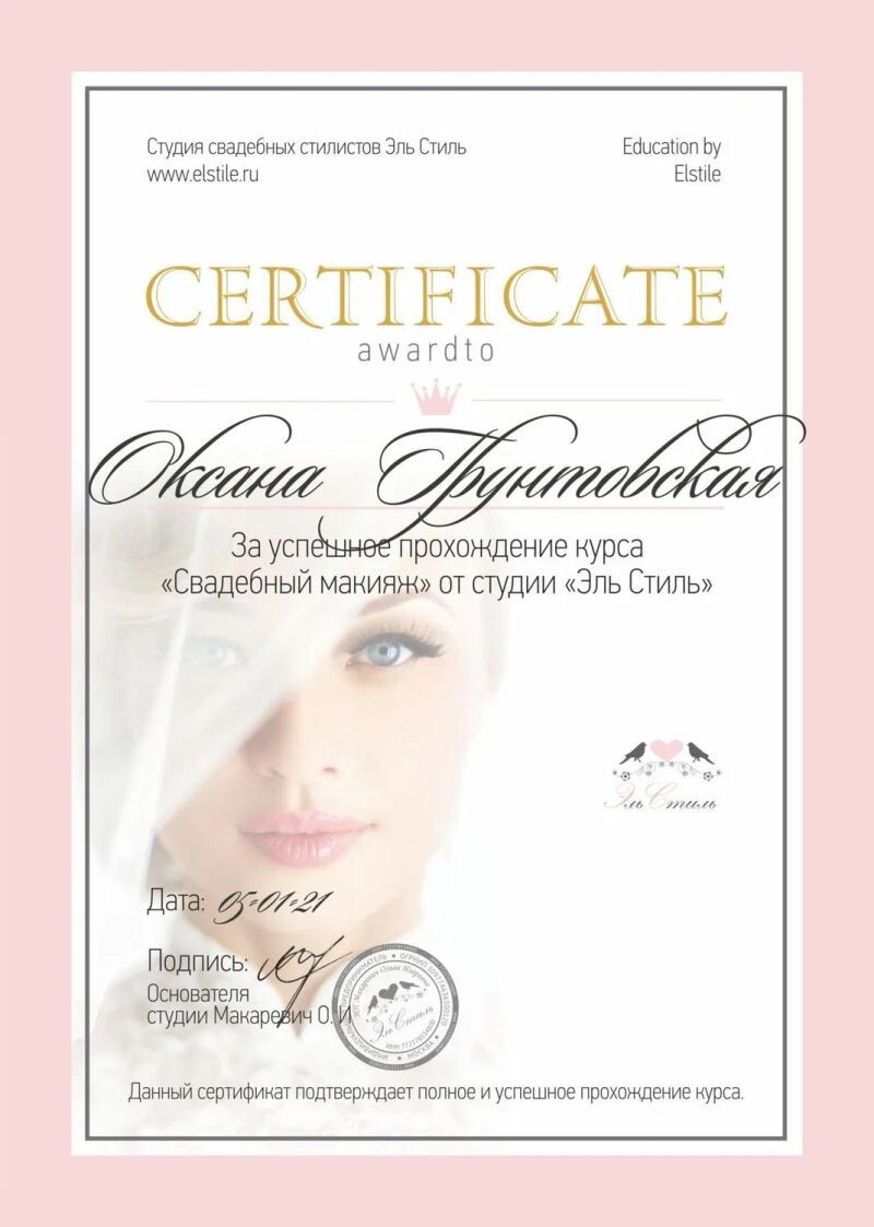 - Студия свадебных стилистов «Эль Стиль», курс «Свадебный макияж», 2021 г.