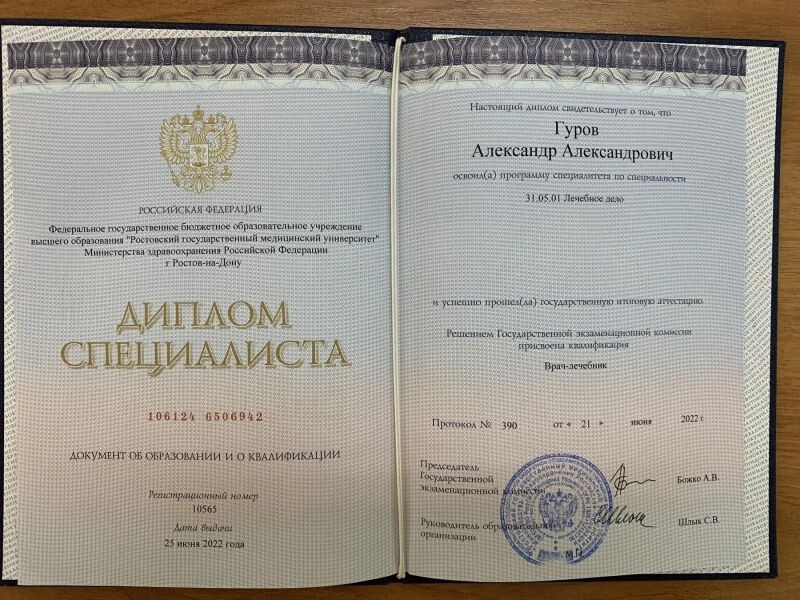 - Ростовский государственный медицинский университет, специальность «Лечебное дело», квалификация «Врач-лечебник», 2016–2022 гг.