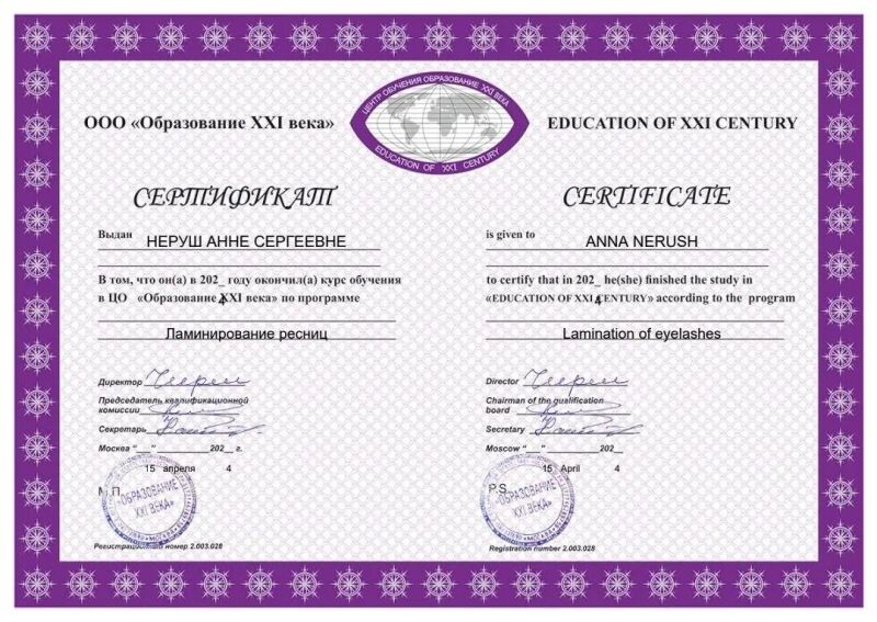 - Образование XXI века, программа «Ламинирование ресниц», 2024 г.