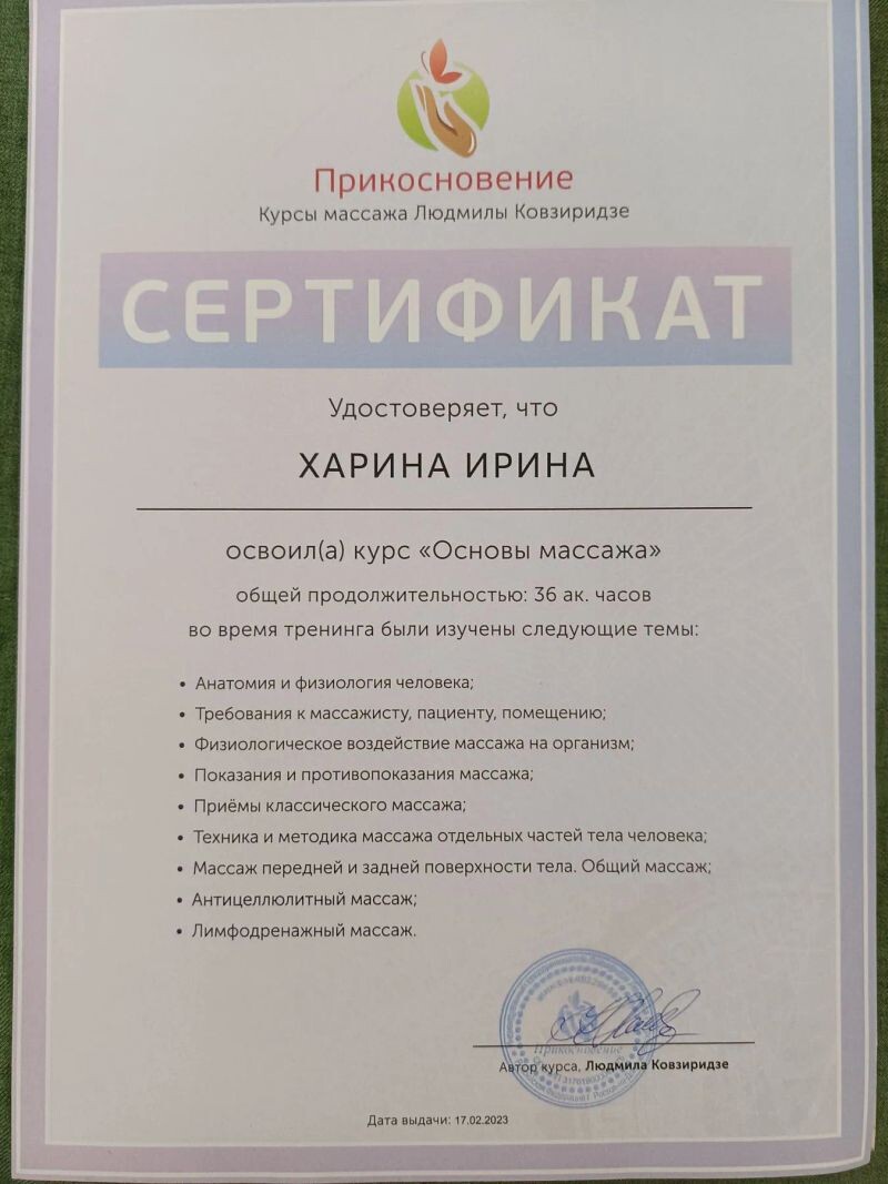 - Школа массажа "Прикосновение" Основы массажа. Косметик-эстетист "Русский дом косметологии" Структурно пластическое моделирование лица и тела. " Школа СПМ Ольги Матяш" г. Краснодар (с 2021 г.).