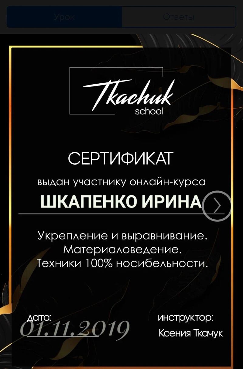 - Школа Ткачук, онлайн-курс «Укрепление и выравнивание. Материаловедение. Техники 100% носибельности», 2019 г.