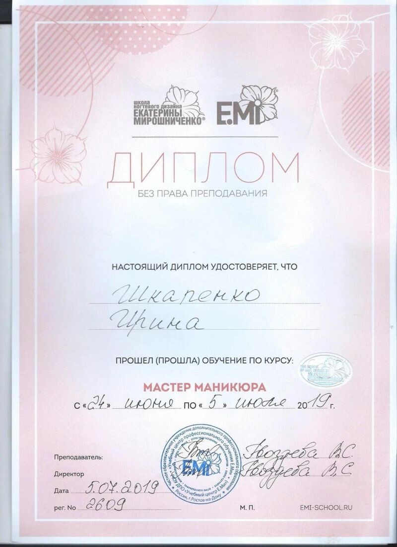 - Учебный центр «Еми», мастер маникюра, 2019 г.