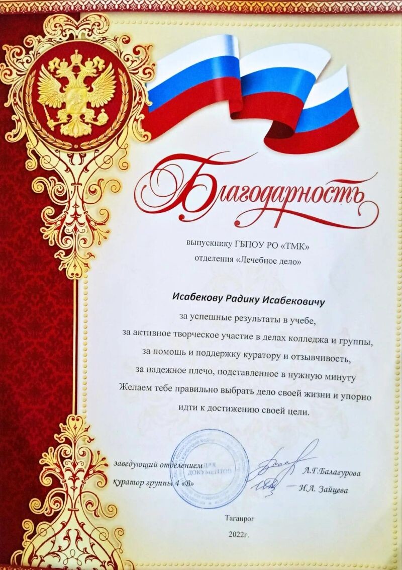 - Таганрогский медицинский колледж, благодарность за успешные результаты в учёбе, активное участие в жизни колледжа, 2022 г.