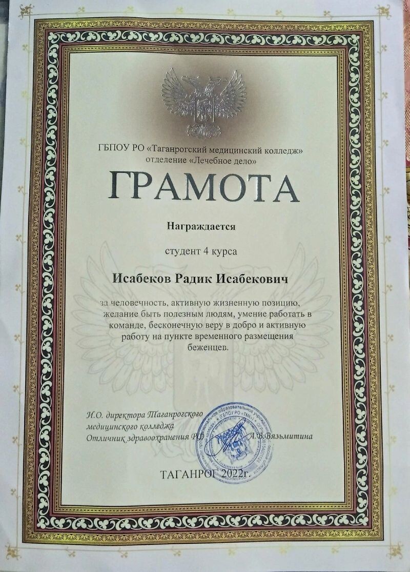 - Таганрогский медицинский колледж, грамота за человечность, активную помощь на пункте временного размещения беженцев, 2022 г.