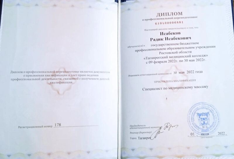 - Таганрогский медицинский колледж, специалист по медицинскому массажу, 2022 г.