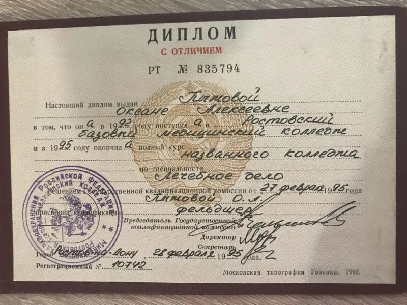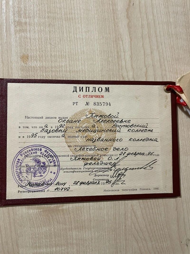 - Ростовский базовый медицинский колледж, специальность «фельдшер-акушер», 1992–1995 гг.