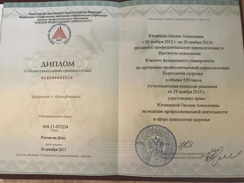 - ЮФУ, профессиональная переподготовка по программе «Психология здоровья», 2012–2013 гг.
