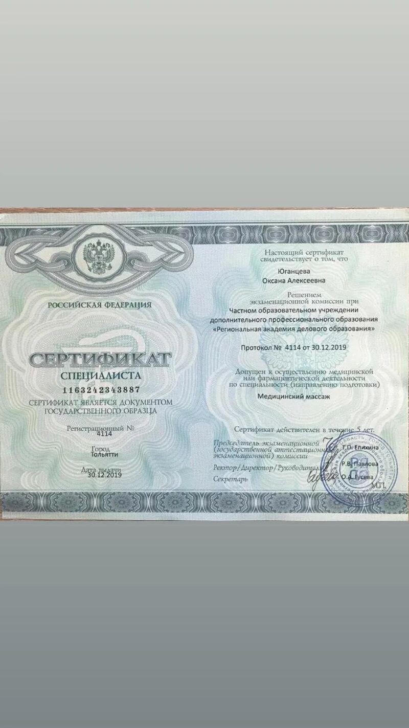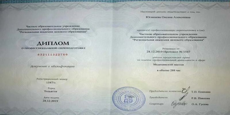- РАДО, направление «Медицинский массаж» (сертификат действителен в течение 5 лет) (с 2019 г.).