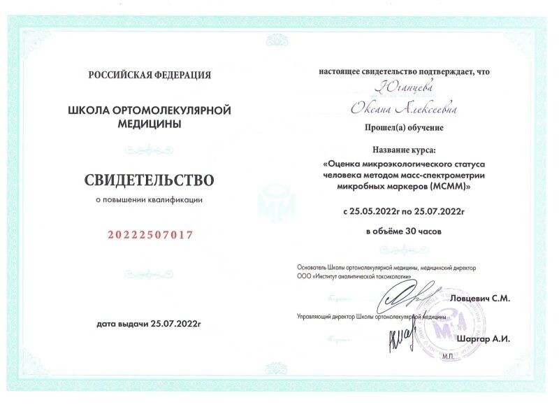 - Школа ортомолекулярной медицины, курс «Оценка микроэкологического статуса человека методом масс-спектрометрии микробных маркеров», 2022 г.