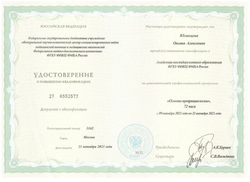 - Академия постдипломного образования ФГБУ ФНКЦ ФМБА России, программа «Основы нутрициологии», 2023 г.