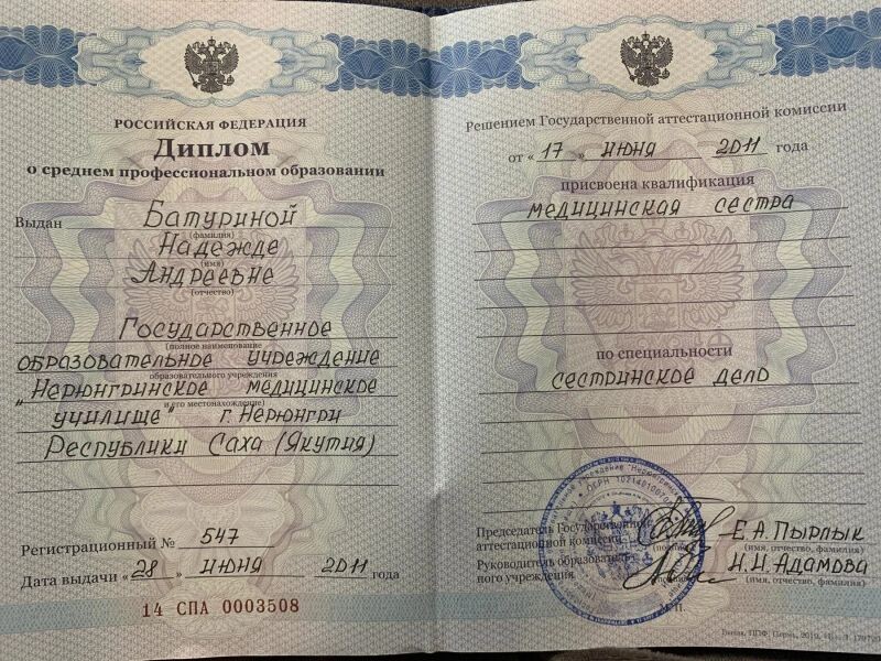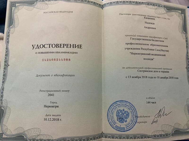 - ГБПОУ Республики Саха (Якутия) «НМК», сестринское дело в терапии, 2018 г.
