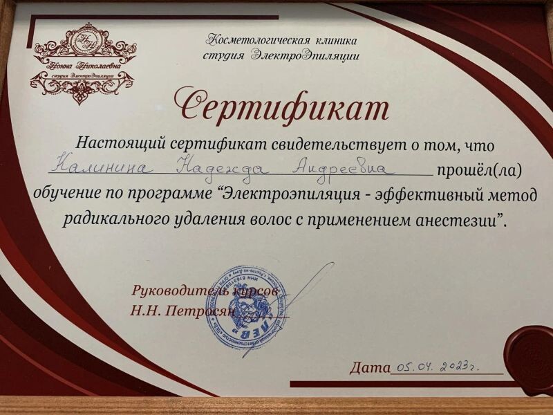 - Косметологическая клиника студия ЭлектроЭпиляции, обучение по программе «Электроэпиляция - эффективный метод радикального удаления волос с применением анестезии», 2023 г.
