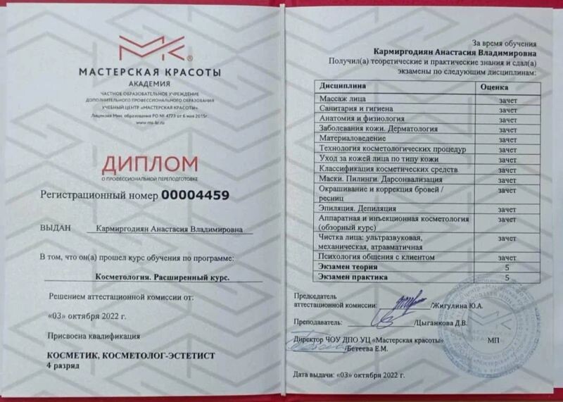 - Учебный центр «Мастерская красоты», косметолог-эстетист 4 разряда, 2022 г.