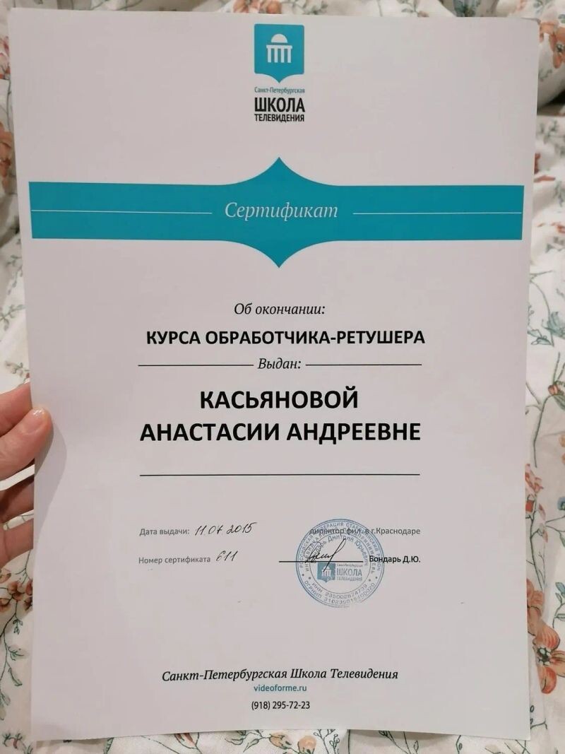 - Санкт-Петербургская Школа телевидения, обработчик-ретушер, 2015 г.