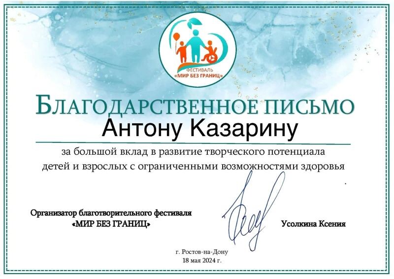 - Сертификат финального голосования портретного фотографа Антона Казарина за участие в конкурсе 35Awards в жанре "Женский портрет". Топ 35 Фотографов Ростова-на-Дону (с 2025 г.).