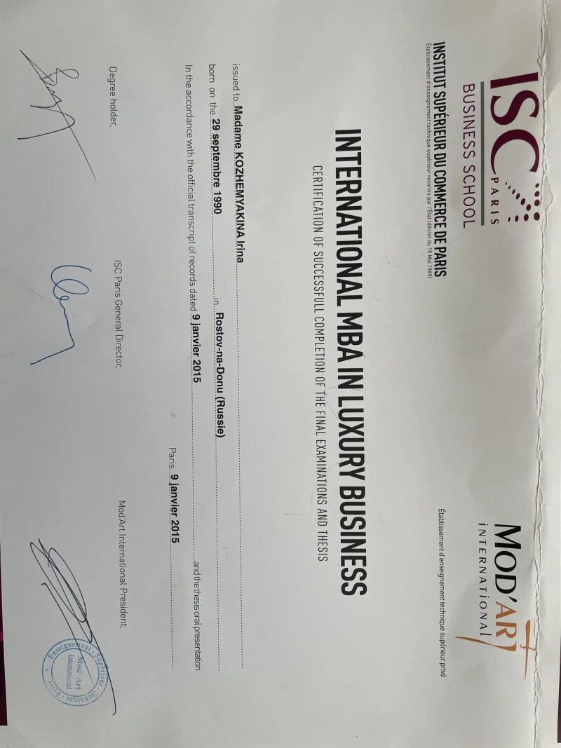 - Business School ISC Paris and Mod'Art International, INTERNATIONAL MBA IN LUXURY BUSINESS, 2013–2015 гг.