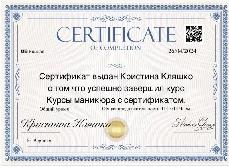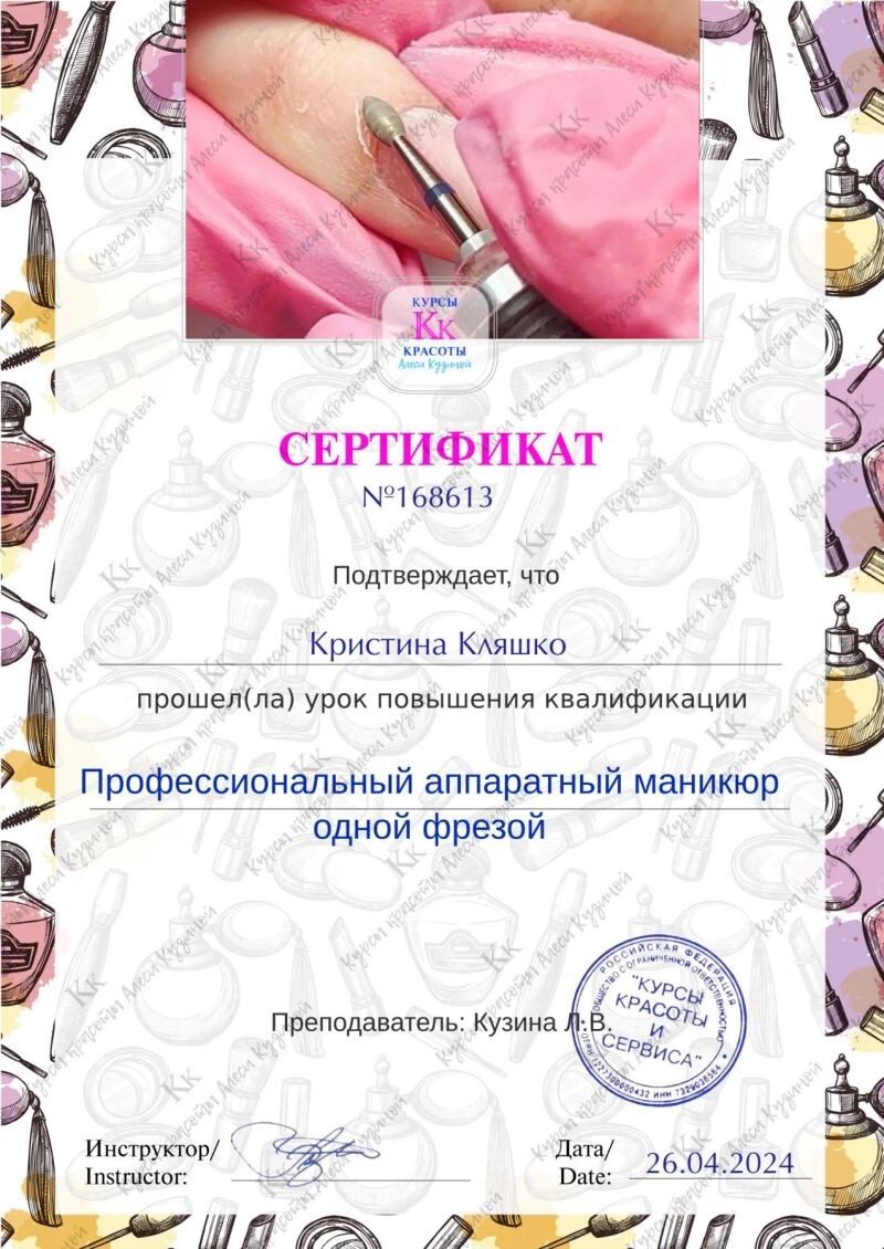 - Курсы красоты и сервиса, курс «Профессиональный аппаратный маникюр одной фрезой», 2024 г.