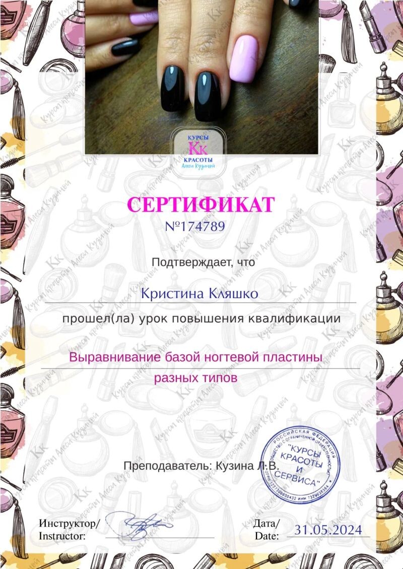 - Курсы красоты и сервиса «Выравнивание базой ногтевой пластины разных типов», 2024 г.
