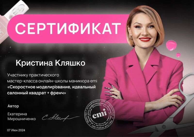 - ООО «Учебный центр профессионального обучения Е.Ми», мастер-класс «Скоростное моделирование, идеальный салонный квадрат + френч», 2024 г.