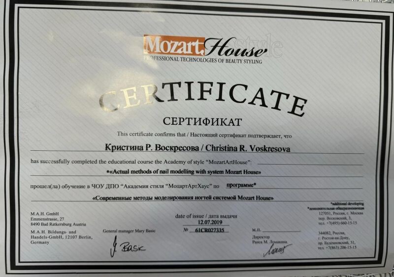 - ЧОУ ДПО «Академия стиля „МоцартАргХаус“», курс «Современные методы моделирования ногтей системой Mozart Houses», 2019 г.