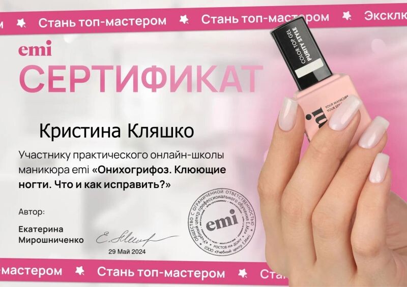 - ООО «Учебный центр профессионального обучения Е.Ми», курс «Онихогрифоз. Клюющие ногти. Что и как исправить?», 2024 г.
