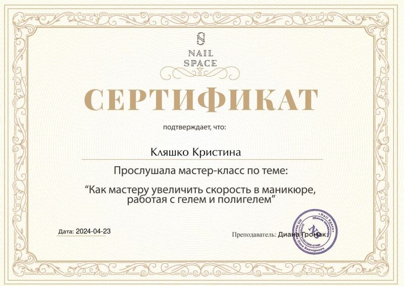 - Nail space, мастер-класс «Как мастеру увеличить скорость в маникюре, работая с гелем и полигелем», 2024 г.