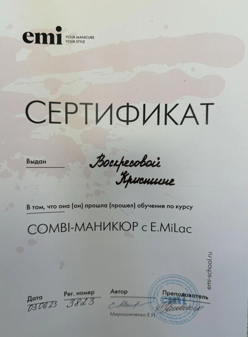 - ООО «Учебный центр профессионального обучения Е.Ми», курс «СОМВІ-МАНИКЮР с E.MiLac», 2023 г.