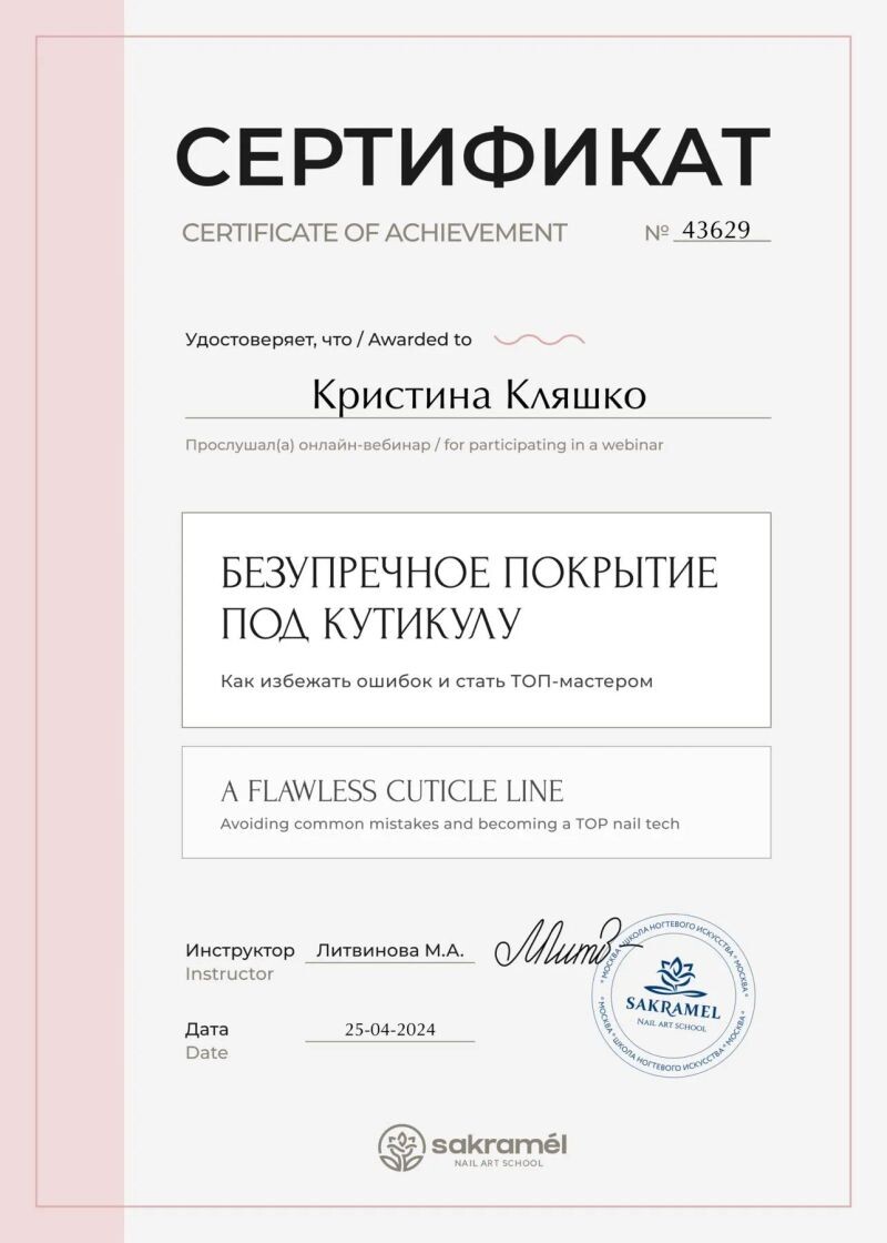 - Sakramel, вебинар «Безупречное покрытие под кутикулу», 2024 г.