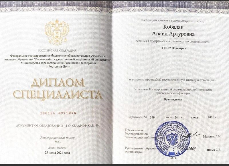 - Ростовский государственный медицинский университет, педиатрия, 2015–2021 гг.