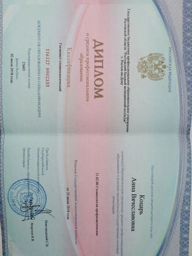 - Ростовский базовый медицинский колледж, стоматология профилактическая, 2015–2018 гг.